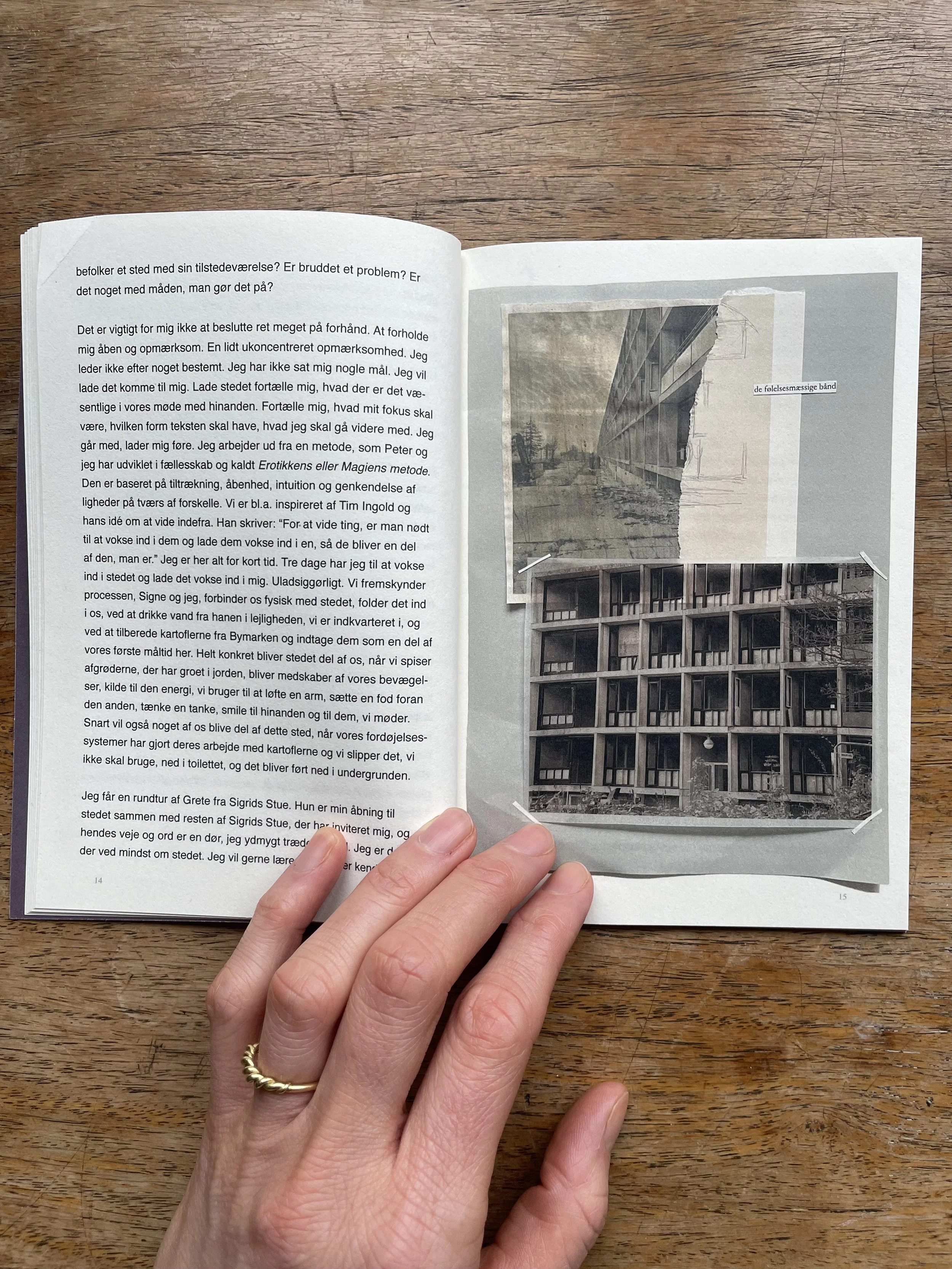 Bogen er blevet til på baggrund af en invitation fra den sociale kunstplatform Sigrids Stue, der er forankret i Gellerupparken, og hvis cirkulære og omsorgsfulde praksis har inspireret mit arbejde med teksten. I bogen udforsker jeg fem forbundne steder i Gellerupparken vha. forskellige metoder, bl.a. skriveøvelser, lerindsamling og stedsspecifikke collager, som indgår i bogen. Jeg spekulerer over, hvordan man lærer et sted at kende, og må tale forfatter Nan Shepherd efter munden: “Det, der skal kendes, vokser med kendskabet.” Steder er uudtømmelige! Ikke mindst et sammensat og politisk betændt område i hastig forandring som Gellerup.